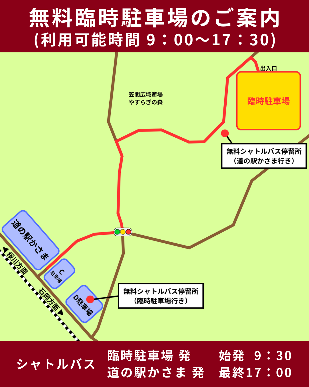 また、上記期間中は臨時駐車場-道の駅かさま間の無料シャトルバスを運行いたします。