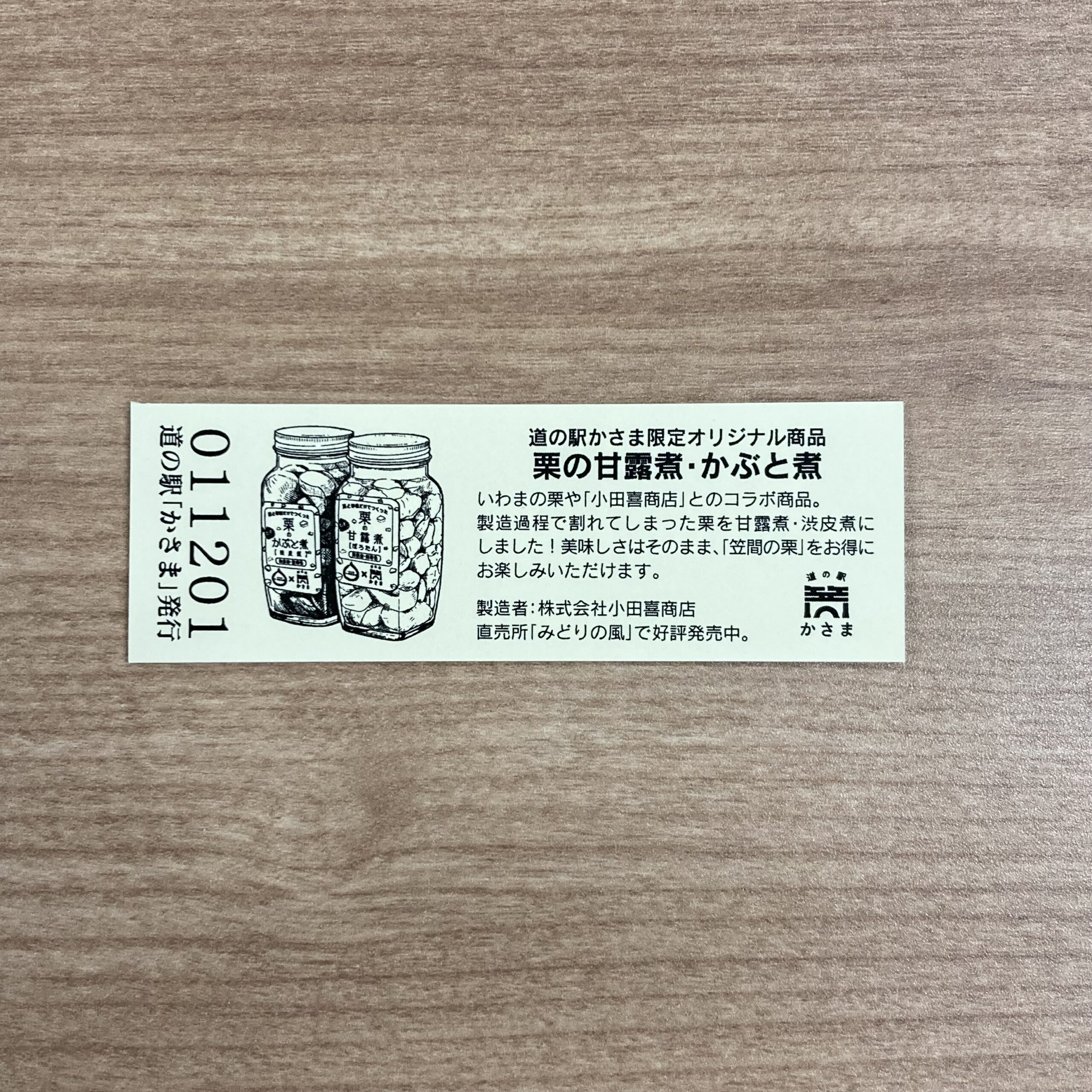 今回のデザインでは、道の駅かさま限定オリジナル商品「栗の甘露煮・かぶと煮」をご紹介しています。